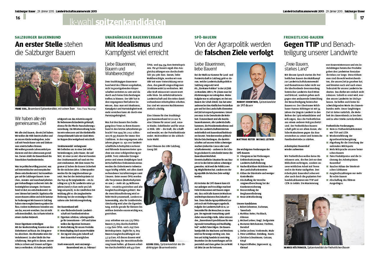 „Die Wahl der Mitglieder der Vollversammlung der Kammer für Land- und Forstwirtschaft in Salzburg und der Mitglieder der Bezirksbauernkammern im Land Salzburg, wird für Sonntag, 22. Februar 2015 (Wahltag) ausgeschrieben. Als Stichtag wird der 2. November 2014 festgesetzt“, heißt es wortwörtlich in der Kundmachung des Landes Salzburg vom 18. September. Wahlberechtigt sind knapp 30.000 Bäuerinnen und Bauern, neben der Landwirtschaftskammer wählen sie auch die Vollversammlung der Bezirksbauernkammern. Nach dem Wahlergebnis werden auch die Ortsausschüsse zusammengesetzt.